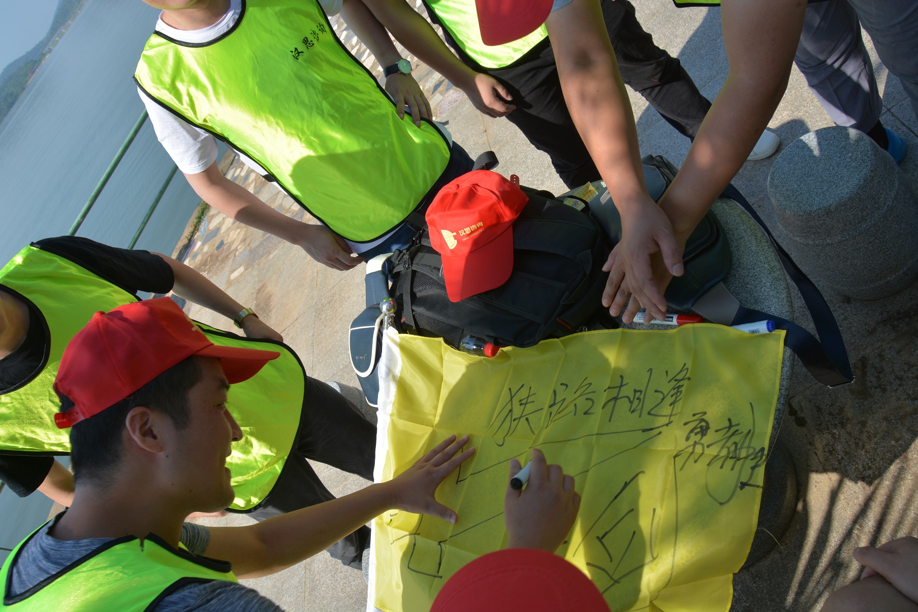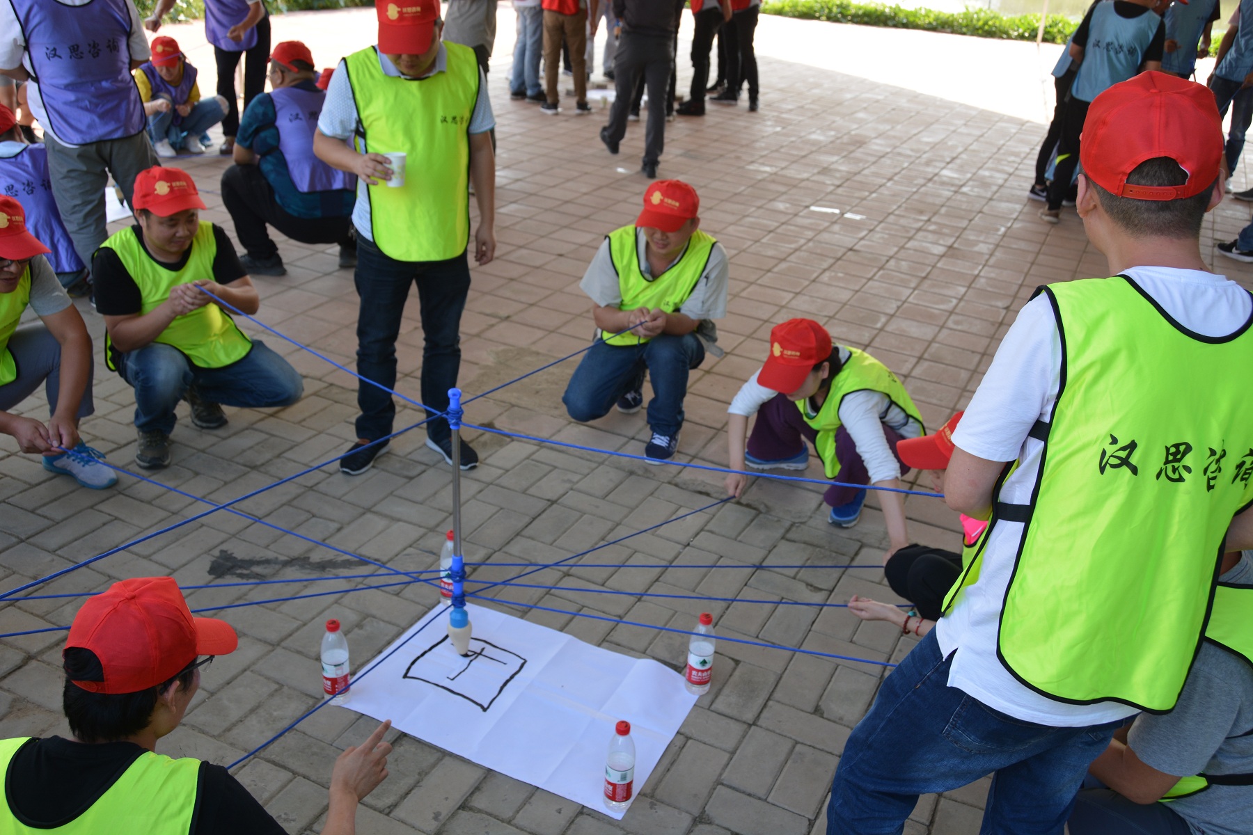 “一個巴掌拍不響,一根筷子易折斷”,妙筆生花活動充分說明了團(tuán)隊成員之間協(xié)作的重要性。12名團(tuán)隊成員各拉著一根繩子的末端,彼此配合,彼此提醒,同心協(xié)力寫出了“團(tuán)隊”二字。
